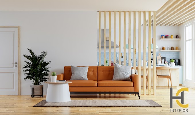 Living room interior wall mockup in warm tones with leather sofa which is behind the kitchen